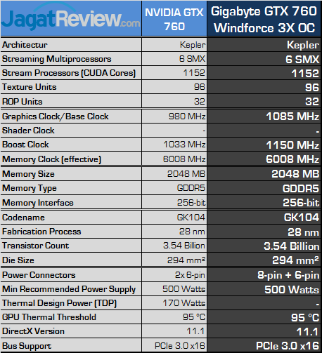 Gigabyte GTX 760 Windforce 3X OC dilengkapi spesifikasi clock lebih tinggi dimana Gigabyte menaikkan nilai clock GPU sebesar 105 MHz di atas nilai reference-nya. Gigabyte menjamin GeForce GTX 760 mereka mampu menyentuh nilai boost clock sebesar 1150 MHz. Sedangkan nilai boost clock maksimal yang tercatat pada pengujian kami adalah sebesar 1215 MHz.