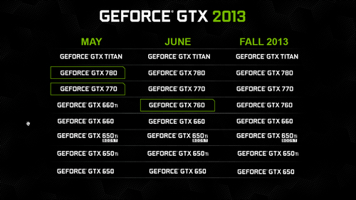 Hadirnya lini GeForce GTX 700 membuat NVIDIA melakukan update pada penempatan produk graphics card mereka seperti terlihat pada slide presentasi di atas. GeForce GTX 680, GTX 670, dan GTX 660 Ti akan digantikan oleh GeForce GTX 780, GTX 770, dan GTX 760. Tidak hanya itu, terlihat pula setidaknya hingga menjelang akhir tahun 2013, tampaknya GeForce GTX 760 akan menjadi varian terakhir dari lini GeForce GTX 700. Apakah hal ini menandakan pada perilisan berikutnya NVIDIA akan menghadirkan graphics card satu generasi di atas GeForce GTX 700 atau akan tetap mengisi lini seri tersebut? Kita nantikan saja perkembangannya di kemudian hari.