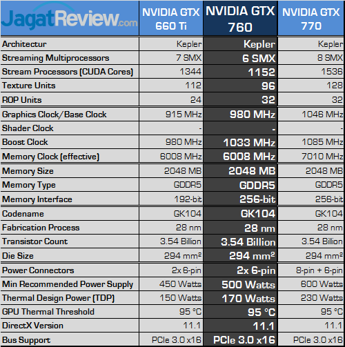 GeForce GTX 760 ternyata diotaki chip GPU GK104 dengan 6 buah unit SMX aktif. Chip GPU GK104 dengan 6 unit SMX aktif pertama kali digunakan NVIDIA pada GeForce GTX 660 OEM alias graphics card tersebut tidak dijual secara umum. Untunglah NVIDIA tetap mempertahankan 4 buah kontroler memori 64-bit pada GK104 sehingga ROP Units tidak dipangkas jumlahnya.