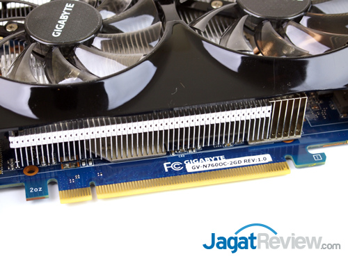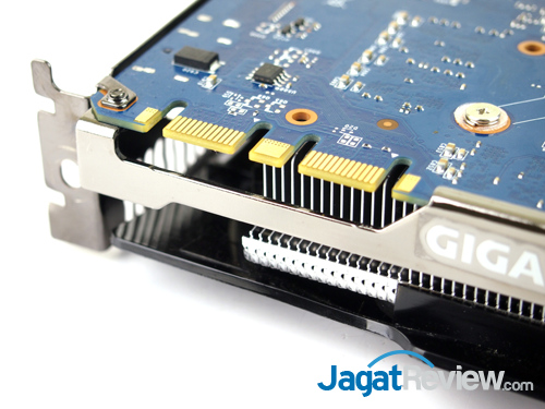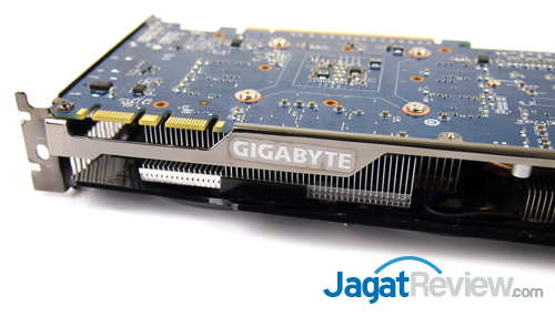Sisi samping PCB Gigabyte GTX 760 Windforce 3X OC dilengkapi pelat metal untuk memudahkan pemasangan dan mencegah PCB graphics card menjadi bengkok.