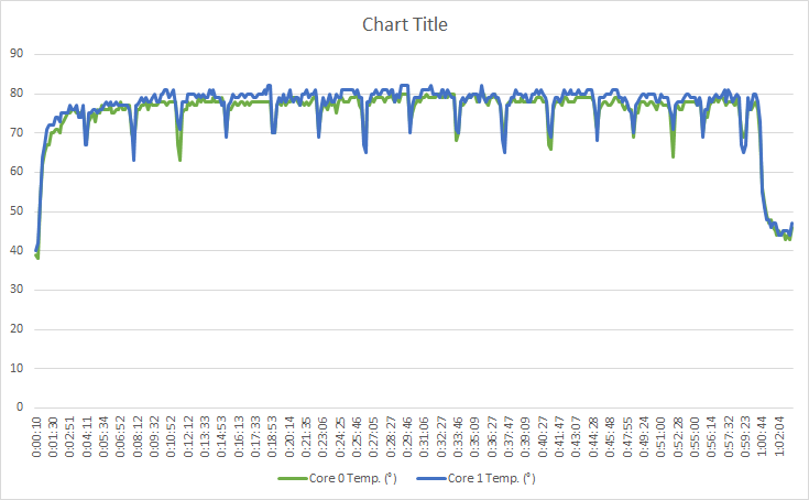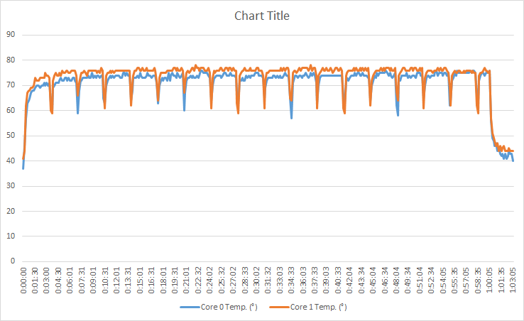 Terlihat bahwa rata-rata suhu idle pada core 0 terjadi pada 40oC dan rata-rata suhu yang terjadi saat terjadi load ada pada 71oC sedangkan pada core 1 rata-rata suhu idle pada terjadi pada 41oC dan rata-rata suhu yang terjadi saat terjadi load ada pada 73oC. Suhu maximum yang dicapai saat terjadi load pada core 0 terjadi pada 76oC sedangkan pada core 1 78oC.