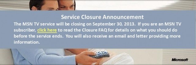 “Selama dekade terakhir, kita telah bersemangat untuk membangun produk kepada pelanggan Kami dengan akses mudah internet ke TV. Sayangnya, semua hal baik akhirnya harus berakhir. Hari ini kami mengumumkan bahwa kami akan menutup layanan MSN TV. Hari terakhir dari layanan MSN TV ialah September 30 2013. Kami ingin transisi ini menjadi sehalus mungkin bagi Anda,” kata pihak MSN TV melalui emailnya, dilansir dari All Things Digital.