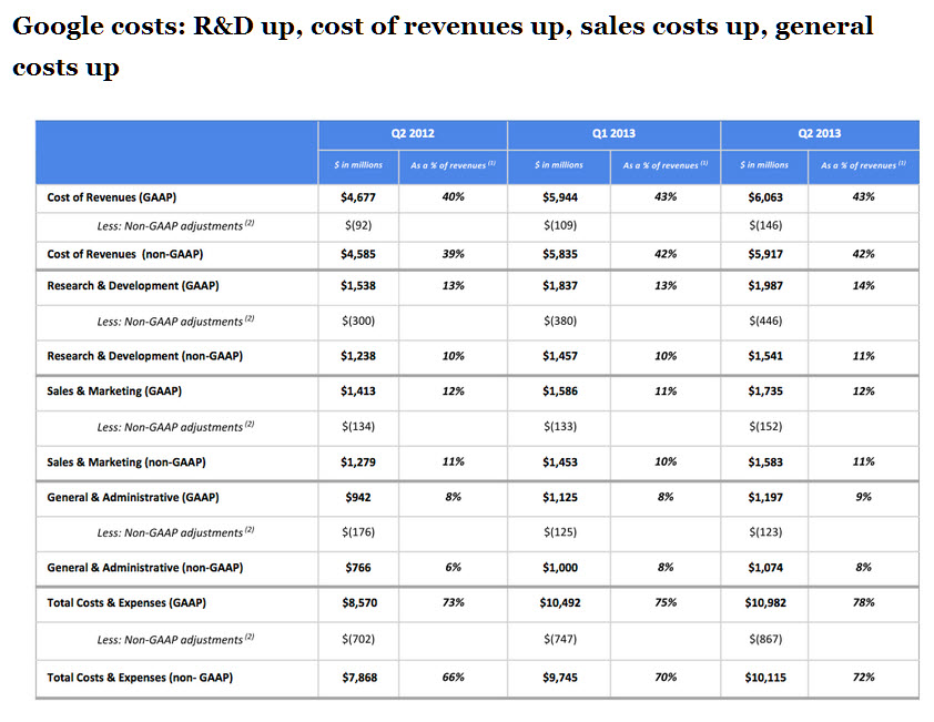 Namun pertumbuhan ini, dilansir dari Cnet, tidak diiringi oleh laba Google yang berasal dari saham (earnings per share = EPS). Laba saham mereka dari tahun lalu sebesar US$ 10,13 turun menjadi US$ 9,71 per lembar saham. Begitupun juga dengan harga saham Google pada penutupan bursa New York hari kamis waktu setempat, dari US$ 1.000 turun lima persen menjadi US$ 910,68 per lembar saham. Walau demikian, angka perolehan harga saham Google tersebut telah naik 29 persen dibanding tahun lalu.