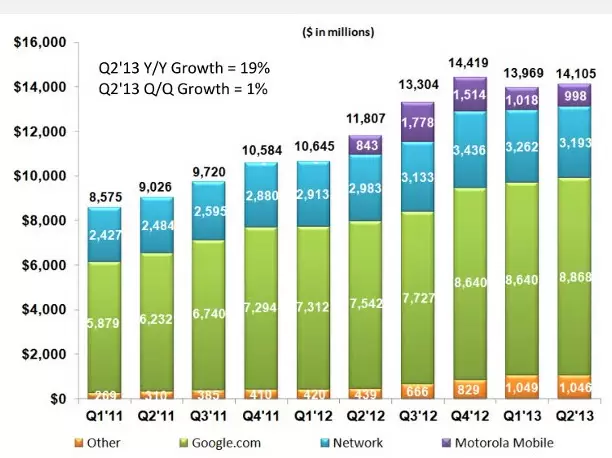 Pendapatan terbesar mereka masih ditopang dari bisnis inti mereka, search engine google.com sebesar US$ 8,8 miliar. Sementara pendapatan anak perusahaan mereka yang baru setahun diakuisisi google, yakni Motorola berkontribusi sebesar US$ 998 miliar. Paling tidak, sumbangsih Motorola jauh lebih baik dari dua tahun sebelumnya pada periode yang sama.