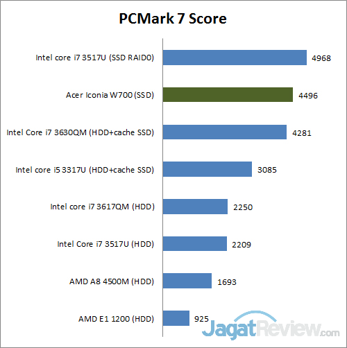 Penggunaan storage Solid State Drive pada Acer Iconia W700 meningkatkan kinerja perangkat ini cukup signifikan. Selain dapat memberikan kinerja yang tinggi, penggunaan SSD juga membawa keuntungan karena perangkat ini akan menjadi lebih tahan bantingan dan getaran ketika digunakan di dalam perjalanan. Dengan hasil tersebut, Anda dapat menjalankan aplikasi menengah keatas dengan baik dan lancar.