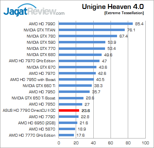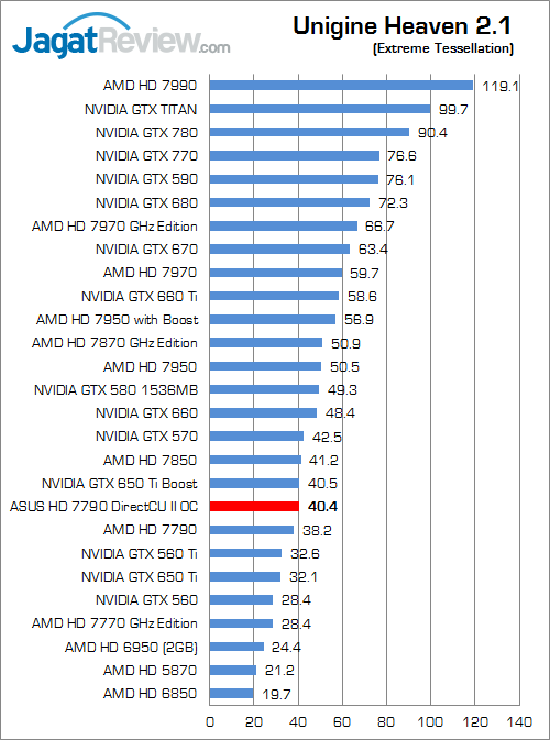 Pada Unigine Heaven 2.1, performa ASUS HD 7790 DirectCU II OC unggul sekitar 5.8% di atas HD 7790 reference, sedangkan pada versi 4 keunggulan tersebut berkisar 3.5%.
