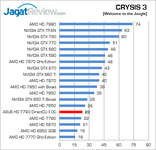 Pada game besutan Crytek menggunakan engine teranyarnya ini, ASUS HD 7790 DirectCU II OC mampu unggul sebesar 4.5% disbanding HD 7790 reference.