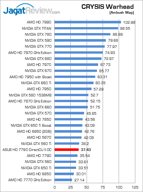 Game FPS besutan studio Crytek ini memperlihatkan ASUS HD 7790 DirectCU II OC unggul sekitar 5.3% di atas HD 7790 reference.