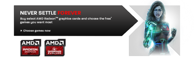 AMD dalam jangka waktu yang singkat berhasil meningkatkan penjualan jajaran graphics card Radeon HD 7000 series miliknya dengan memberikan promo yang sangat menarik untuk para gamer, yaitu game gratis!. Promosi yang disebut dengan nama campaign “Never Settle” ini memberikan game gratis dengan berbagai judul kelas AAA yang bernilai sekitar US$ 50-60 per-game untuk setiap pembelian produk graphics card Radeon HD 7000 series.