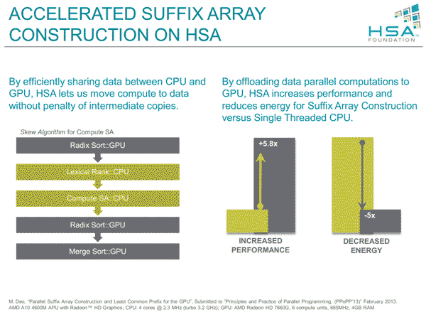 Sebuah pengujian lainnya dilakukan untuk meneliti peningkatan performa pada cloud system. Hal yang diuji adalah akselerasi suffix arrays construction. Dalam pengujian ini ditemukan bahwa dengan memanfaatkan CPU dan GPU dengan menggunakan HSA bisa diperoleh peningkatan performa 5,8x lipat dan konsumsi daya berkurang 5x.