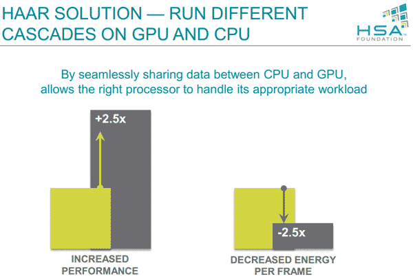 Pada pengujian ini, HSA tampak berhasil melakukan pembagian data antara CPU dengan GPU secara mulus. Penggunaan HSA dalam tahap awal ini berhasil meningkatkan performa deteksi sekitar 2,5x lipat lebih tinggi dengan penggunaan daya 2,5x lebih rendah.