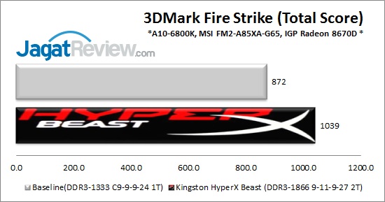 Aplikasi 3DMark Fire Strike merupakan sebuah benchmark 3D berbasis API DirectX 11. Khususnya pada sistem berbasis AMD APU yang menggunakan grafis terintegrasi, performa sistem akan sangat bergantung pada performa memori. Di tes ini, sistem yang memiliki memory bandwidth besar akan mendapat skor yang optimal.