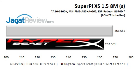 Berikut ini hasil pengujian performa dari Kingston HyperX Beast DDR3-1866Mhz, kami juga menyertakan performa dari RAM dengan kecepatan DDR3-1333, timing 9-9-9-24 1T(CAS-TRCD-TRP-TRAS-CMD Rate) sebagai baseline, karena inilah konfigurasi yang masih digunakan sebagian besar user.