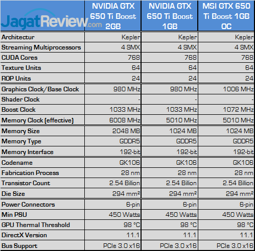 GeForce GTX 650 Ti Boost dengan kapasitas memori 1GB tetap memiliki spesifikasi mirip dengan versi 2GB kecuali pada clock memori. GeForce GTX 650 Ti Boost 1GB hanya dilengkapi clock memori sebesar 5010 MHz sementara versi 2GB dilengkapi clock memori sebesar 6008 MHz. Sejauh mana perbedaan performa akibat pemotongan clock memori tersebut akan kita ketahui di artikel ini.