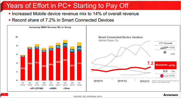Bahkan, penjualan smartphone dan tablet telah melampui bisnis inti mereka, yakni PC. Hal itu pertama kalinya bagi Lenovo, semenjak perusahaan mulai tertarik membesut kedua perangkat pintar itu. Secara keseluruhan, termasuk PC, smartphone, dan tablet mengalami pertumbuhan penjualan hingga 41 persen dari tahun lalu. Lenovo mengklaim, telah menjadi pemasok smartphone terbesar keempat di dunia dan mencatat pertumbuhan tercepat 132 persen di antara lima vendor teratas lainnya.