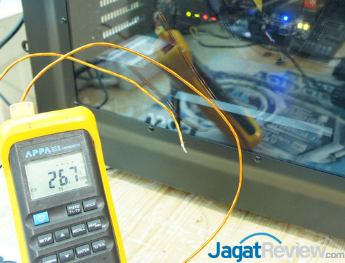 Sistem akan dipasang ke dalam sebuah casing Cooler Master HAF XM, dengan watercooling dipasang pada bagian 240mm atas(Fan casing diatas dicabut). Casing ditutup rapat, dan suhu ruang pengujian dijaga pada 26-27 C.