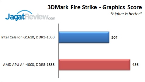 Sesuai dugaan, GPU terintegrasi milik AMD memberikan skor jauh diatas solusi GPU milik Intel. Namun, seperti yang terlihat pada benchmark Cinebench R11.5, Intel Celeron G1610 nampak unggul pada Physics Test, yang berfokus pada CPU.