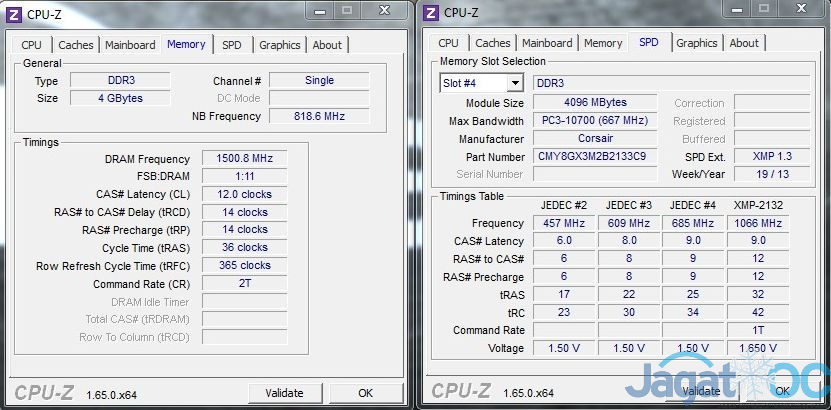 Corsair Vengeance Pro series yang digunakan untuk AOCT 2013 semuanya menggunakan chip memori Hynix MFR dengan konfigurasi single-sided. Perlu diketahui, konfigurasi seperti ini biasanya hanya terjadi pada ram kit mahal berkecepatan tinggi (DDR3-2800++). Chip Hynix yang terkenal suka dengan voltase ini dapat memberikan overclockability yang luar biasa, dibawah ini, kami dengan mudah menyentuh DDR3-3000Mhz di motherboard MSI Z87 MPOWER SP, hanya dengan 1.75V: