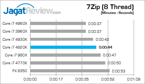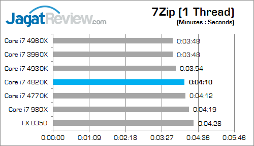 7Zip merupakan aplikasi kompresi file ke format 7z. Aplikasi ini mampu menggunakan multiple core sehingga menjadi aplikasi yang cocok untuk mengukur kinerja dari core per core dari prosesor. Hasil pengujian disajikan dalam satuan waktu. Semakin sedikit waktu yang dibutuhkan, semakin baik.