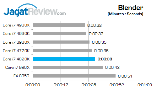 Blender merupakan aplikasi “open source” untuk 3D-modelling. Kami menguji kinerja prosesor dalam merender objek 3D di aplikasi ini. Hasil pengujian disajikan dalam satuan waktu. Semakin sedikit waktu yang dibutuhkan, semakin baik.