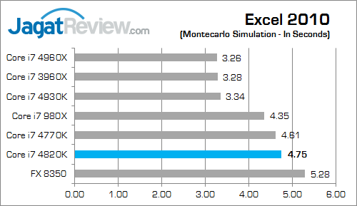 Anda tentu tidak asing dengan aplikasi spreadsheet buatan Microsoft ini. Kami menguji kinerja prosesor dalam menjalankan “Monte Carlo Simulation Table” di aplikasi ini. Hasil pengujian disajikan dalam satuan waktu. Semakin sedikit waktu yang dibutuhkan, semakin baik.