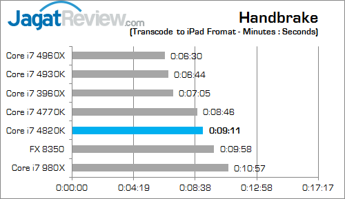Handbrake merupakan salah satu software transcoding gratis yang cukup popular. Program ini mampu memanfaatkan multiple thread dan sangat “senang” dengan clock prosesor yang tinggi. Ini membuatnya program yang ideal untuk menguji “kekuatan” sebuah prosesor.
