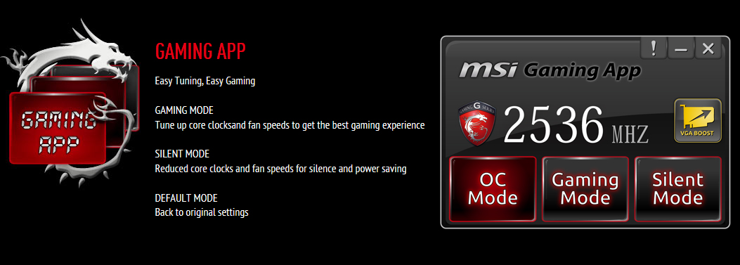 Seperti MSI GTX 780 Twin Frozr Gaming OC, GTX 760 Twin Frozr Gaming OC juga mendukung penggunaan utility MSI Gaming App. Sebuah utility berukuran kecil yang cukup mudah digunakan para penggunanya untuk mengatur ‘perilaku’ graphics cardnya melalui tiga buah profile yang sudah tersedia. Berikut penjelasan masing – masing profil :