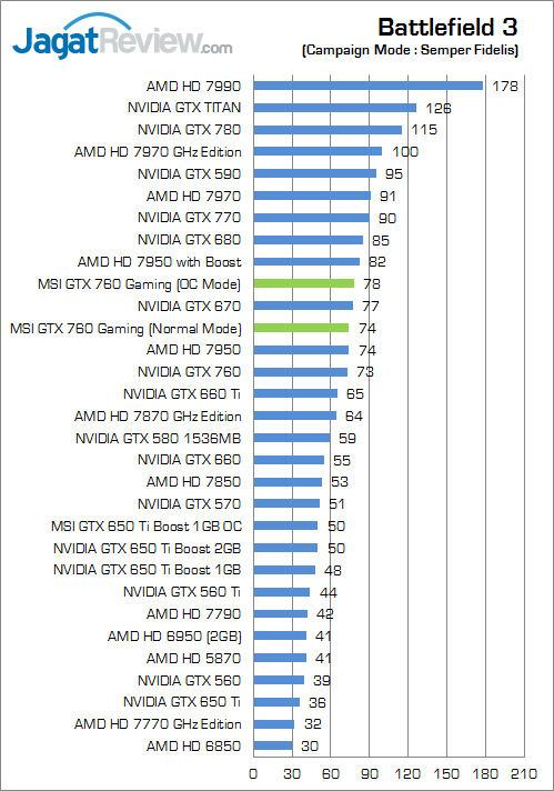 Pada game bertema FPS ini performa GTX 760 Twin Frozr Gaming OC unggul tipis sekitar 1 fps di atas GeForce GTX 760 reference. Sedangkan pada OC Mode graphics card ini tampak menghasilkan fps mendekati GeForce GTX 670.