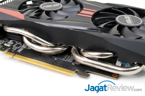 Untuk membantu mengalirkan panas dari chip GPU ke sirip-sirip heatsink dengan cepat, ASUS memasangkan 4 buah heatpipe tembaga berlapis nikel bertipe direct contact atau bersentuhan langsung dengan permukaan chip GPU. Untuk komponen kipas yang bertugas menghembuskan angin dan mengusir panas dari sirip-sirip heatsink, ASUS memasangkan 2 buah kipas berdiameter cukup besar. Kipas tersebut masih menggunakan tipe konvensional dan belum mengadopsi CoolTech Fan yang menggabungkan kipas bertipe blower dan tradisional seperti yang diperkenalkan ASUS pada sejumlah produk DirectCU II lainnya.