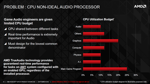 AMD True Audio memungkinkan sejumlah unit Stream Processor untuk mengerjakan pengolahan audio pada game. Alhasil dengan kondisi seperti ini, utilisasi prosesor dapat dikurangi dan proses pengolahan audio dapat ditingkatkan ke tingkat lebih tinggi dengan pengaplikasian berbagai efek tambahan.