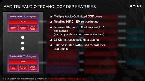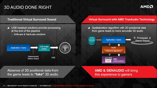 Salah satu feature andalan Radeon R9 dan R7 adalah AMD True Audio. Feature ini tersedia pada graphics card Radeon R9 290X, Radeon R9 290, dan Radeon R7 260X. Satu hal menarik dari teknologi ini adalah hampir sebagian besar presentasi pada ajang GPU14 Tech Day Event membicarakan AMD True Audio.