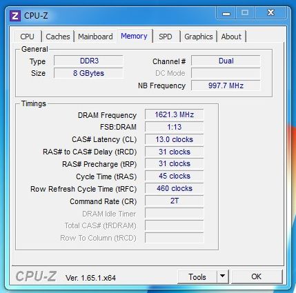 Mencoba lebih jauh lagi dengan timing yang sangat longgar (13-31-31-45), kami berhasil mencapai clock maksimum memori ini, yang ada di kisaran 1620Mhz (DDR3-3240Mhz), di tegangan 1.85V.