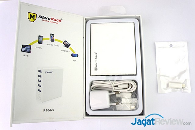 Power Bank Micropack P104-5 mengemas paket penjualannya dengan cukup sederhana dengan memberikan kabel USB, lima buah connector serta sebuah USB AC Adapter. Yang cukup menarik dari connector yang diberikan ini adalah Micropack secara khusus memberikan satu buah connector Lightning yang dikhususkan untuk smartphone Apple seri terbaru yang beredar di pasaran, di mana masih jarang ada paket penjualan Power Bank yang menyertakan connector jenis ini.
