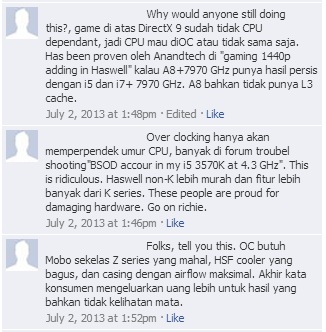 Disini, kami mendapat dua buah pendapat yang berlawanan. Di satu sisi, ada pengguna yang kurang setuju akan overclocking, karena melihat bahwa dengan PCnya yang masih cukup kencang, kegiatan ini sudah tidak ada gunanya, penuh resiko kerusakan, serta kadang malah mengeluarkan dana yang besar, seperti yang kami temui di halaman sosial media berikut: