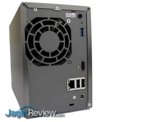 Selain dua drive bay, sisi depan dari NAS ini dihuni oleh tombol power, LED power indicator, LED NAS activity indicator, LED LAN Indicator, LED Status Indicator, serta port USB 3.0. Untuk lampu LED yang ada di bagian depan, pengguna bisa mengatur tingkat brightness dari lampu-lampu tersebut. Selain itu, pengguna juga bisa mengaktif-nonaktifkan lampu-lampu tersebut melalui tool manajemen perangkat.
