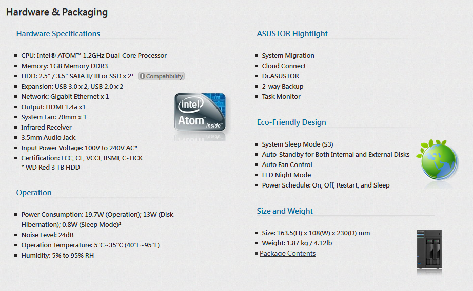 Berikut ini adalah spesifikasi lengkap dari AS-202TE seperti yang tercantum di situs resmi Asustor. Terlihat bahwa NAS ini telah dilengkapi dengan prosesor Intel Atom berkecepatan 1.2 GHz. Penggunaan prosesor Atom tersebut tampaknya dipilih Asustor untuk memastikan NAS ini memiliki performa yang memadai untuk fitur multimedia entertainment yang memang dikedepankan oleh perusahaan tersebut.