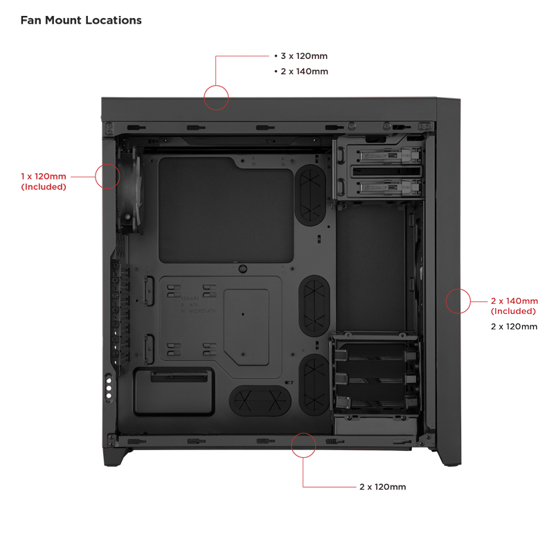 Konsep ini terlihat jelas di beberapa bagian casing, dimana pada bagian atas casing ini mampu dipasang 3 unit fan 120mm dan mendukung penggunaan radiator pendingin watercooling yang berukuran 360 mm (3 x 120 mm). Selain itu, pada bagian depan casing ini juga sudah dilengkapi dengan 2 unit fan berukuran 140mm dan tentunya juga mendukung penggunaan radiator yang berukuran 280 mm 2 x 140 mm).