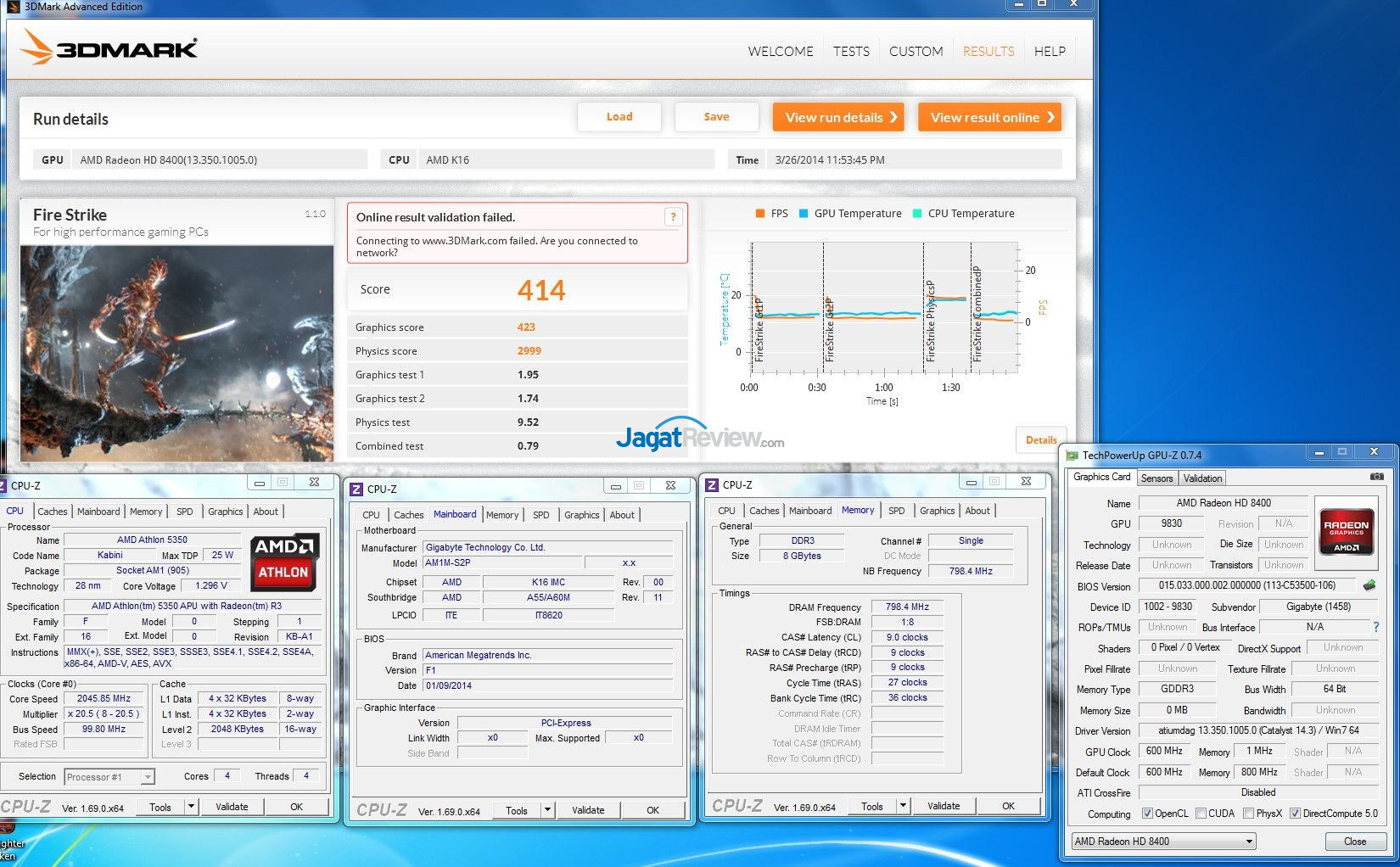 Pada kedua 3DMark, AMD Athlon 5350 yang memiliki AMD Radeon HD 8400(akankah nanti di-rename ke Radeon R3 Graphics? kami juga belum tahu) dengan 128 Radeon Cores berbasis GCN memiliki performa yang mungkin hanya sedikit lebih baik dari solusi Intel HD Graphics 2500(pada Ivy Bridge), dan masih terpaut jauh sekali dari AMD APU Kaveri yang memang memiliki performa grafis yang tinggi.