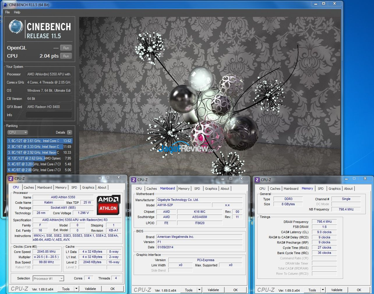 Cinebench R11.5 multi-cpu memiliki hasil yang cukup baik, yakni sekitar 2.04 point. Perlu diketahui, AMD APU Trinity A6-5400K (dual-core) yang memiliki harga serupa dengan Athlon 5350 hanya mendapat sekitar 1.47 Poin. Ini menunjukkan bahwa performa multi-threading dari prosesor berbasis arsitektur Jaguar dengan konfigurasi quad-core ini tidak terlalu lemah seperti yang sempat kami perkirakan.