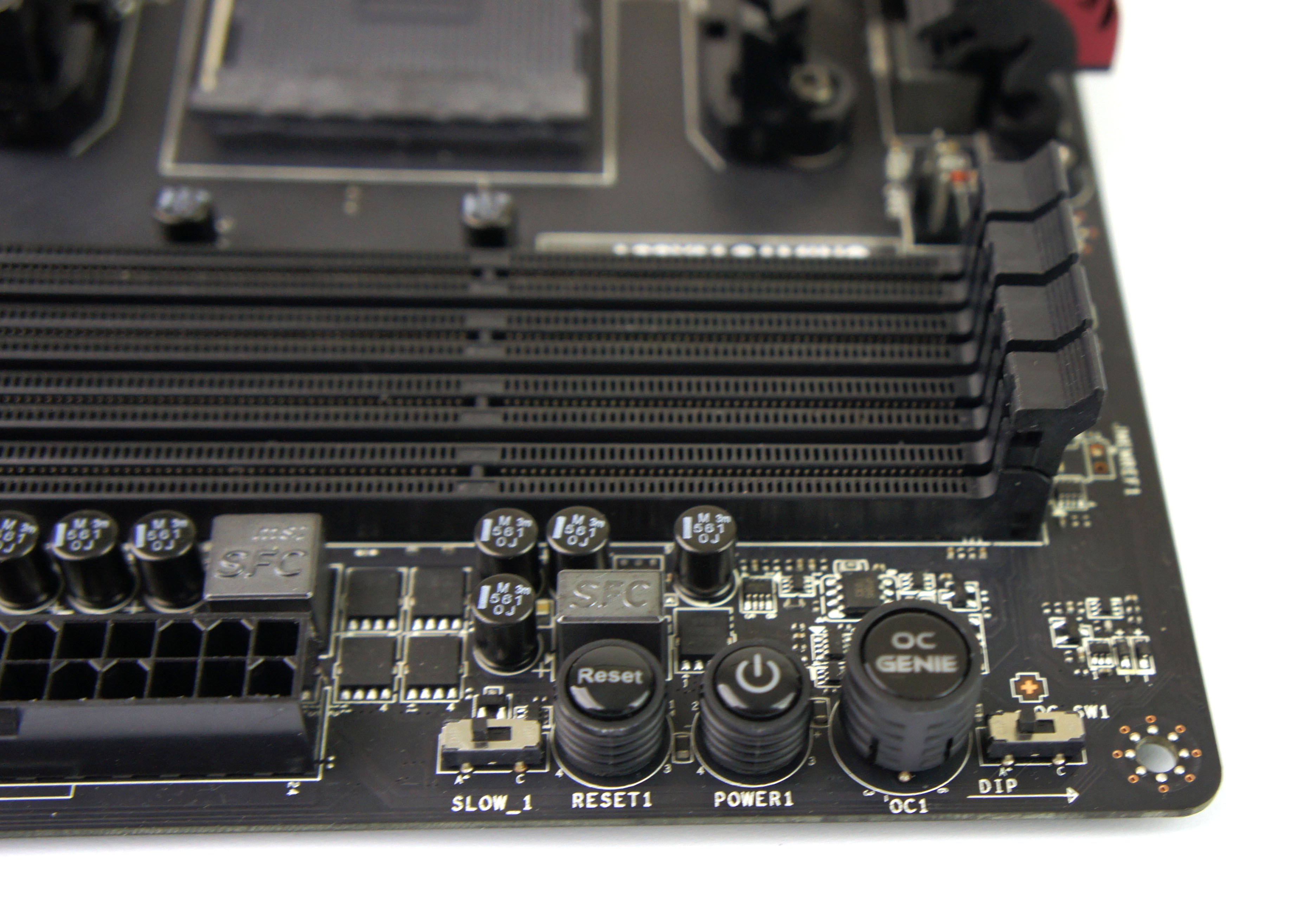 Penampakan motherboard dari atas. Motherboard ini berbalut warna hitam dan merah, membuat motherboard ini menarik untuk dilihat.