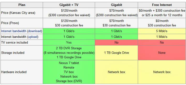 Google Fiber menawarkan kecepatan internet broadband 5Mbps dengan biaya bulanan gratis selama tujuh tahun. Namun, bagi mereka yang menginginkan kecepatan internet hingga 1Gbps, Google mengenakan biaya langganan per bulan US$ 70. Sementara untuk internet yang dilengkapi layanan TV, pelanggan dikenakan tarif US$ 120 per bulan. Untuk biaya instalasinya sendiri, hanya sebesar US$ 30.