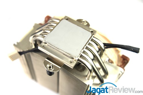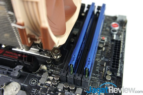 Dapat kita lihat pada gambar diatas, badan nya yang ramping membuat heatsink tersebut tidak menghalangi slot RAM yang ada, sehingga jika Anda ingin memakai RAM ber-heatspreader tinggi tidak perlu khawatir akan mengganggu pemasangan heatsink tersebut.