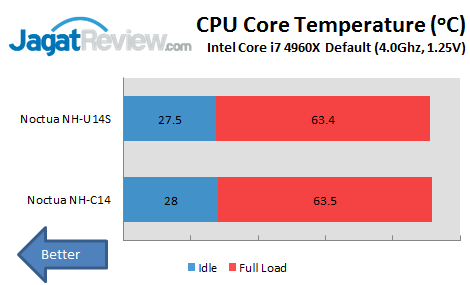 Karena prosesor Intel extreme edition tidak memiliki heatsink bawaan, kami memakai Noctua NH-C14 sebagai pembanding. Performa NH-U14S ini mirip sekali dengan NH-C14. Tercatat suhu maksimal NH-U14S ada dikisaran 63.4oC, sedangkan NH-C14 berada dikisaran 63.5oC, margin yang sangat kecil yaitu berada di kisaran 0.1oC. Saat Idle margin yang tercatat pun sangat kecil, terlihat hanya berbeda sekitar 0.5oC.