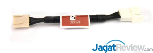 Seperti yang anda lihat dibawah ini, Noctua memberikan sebuah Low Noise Adapter(L.N.A) yang bertujuan untuk mengurangi kecepatan fan menjadi sekitar 900 RPM-an, dari kecepatan maksimumnya sekitar 1500 RPM.