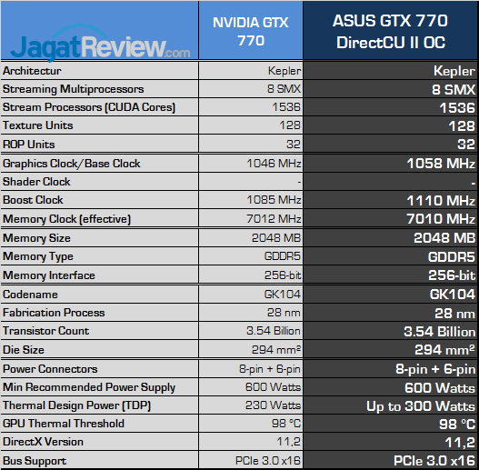 Seperti terlihat pada tabel di atas, jika dibandingkan dengan GeForce GTX 770 reference, ASUS menaikan nilai base clock menjadi 1058 MHz serta nilai boost clock menjadi 1110 MHz. Peningkatan parameter spesifikasi clock oleh ASUS memang terbilang tidak cukup signifikan. Akan tetapi tentu saja ASUS telah mempersiapkan graphics card mereka untuk digeber lebih jauh lagi dengan melakukan overclocking.