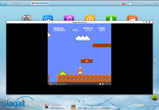 Satu hal yang menarik, kami juga menemukan adanya game Super Mario Bros, salah satu game populer di tahun 1980-an, tersedia di daftar aplikasi untuk TS-421 ini. Ternyata QNAP benar-benar menyediakan fitur untuk memainkan game tersebut melalui sistem operasi QTS yang ada di NAS tersebut. Pengguna bisa mengakses game tersebut langsung melalui jendela browser dimana mereka membuka tool manajemen dari NAS ini.