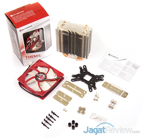 Raijintek memberikan sebuah kipas, mounting AMD, mounting Intel, kertas petunjuk pemasangan, 5 buah karet pengunci kipas (diberikan lebih untuk dijadikan pengganti karet yang rusak), dan thermal paste. Mounting AMD yang diberikan mendukung penggunaan pada socket FM2+/FM2/FM1/AM3+/AM3/AM2+/AM2, sedangkan mounting Intel yang diberikan mendukung penggunaan pada socket LGA 775/1150/1155/1156/1366/2011.