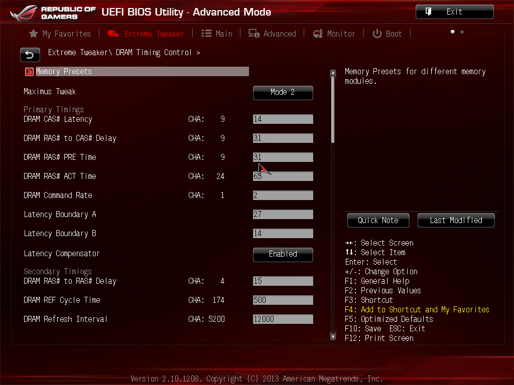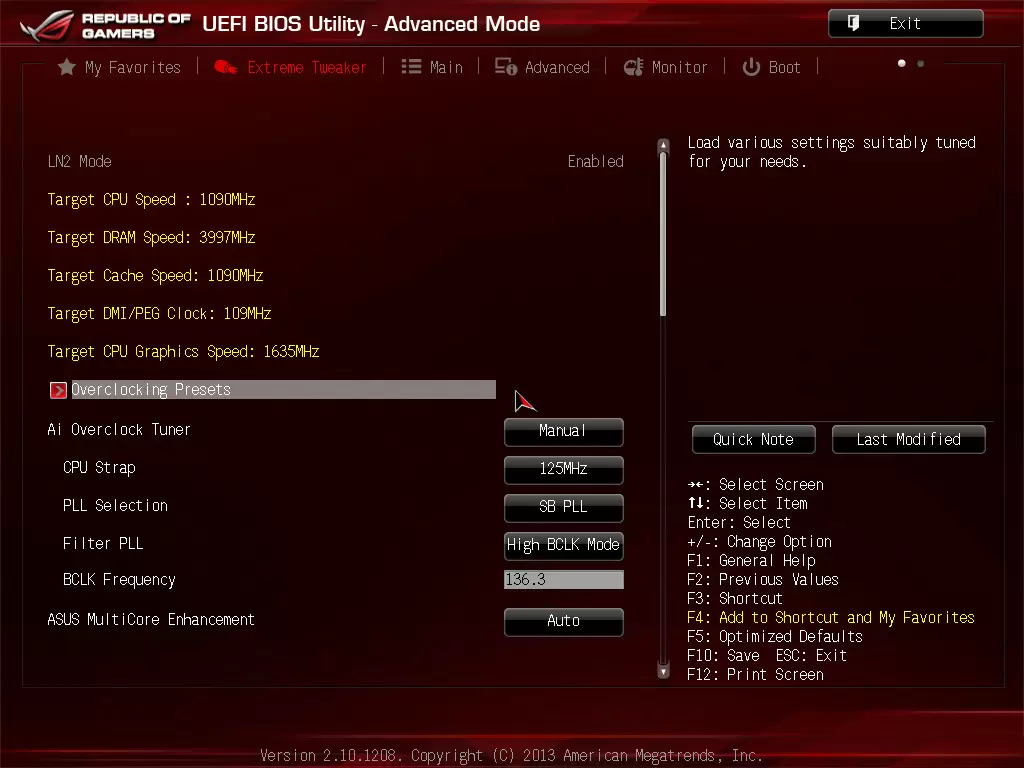 Baiklah, mari melanjutkan ke settings BIOS. Perlu diketahui, ASUS Maximus VI Impact menyediakan banyak sekali preset overclocking ekstrim yang ditujukan untuk melakukan overclocking memori. Kami me-load sebuah preset bernama ‘3930 DRAM Frequency‘ pada BIOS dan melakukan sedikit tweaking tambahan untuk mencapai clock memori tinggi. Berikut ini setting BIOS yang kami gunakan untuk pengujian extreme:
