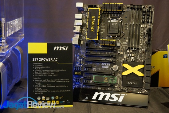 Z97 XPower AC: Motherboard Z97 satu-satunya dari MSI yang memiliki dukungan 4-way SLI dan CrossFire. Motherboard OC kelas atas ini memiliki PWM 16 fase dengan PCB 8 layer yang ukuran E-ATX. Heatsink dari motherboard ini merupakan water block yang dapat digunakan oleh pengguna watercooling untuk membantu mendinginkan VRM motherboard. Selain itu, terdapat juga hardware switch untuk PCIe CeaseFire yang dapat digunakan pengguna untuk melakukan debut saat menggunakan konfigurasi multi Graphics Card. Sesuai namanya, motherboard extreme overclocking ini memiliki modul Wireless AC dan paket penjualan motherboard ini akan disertai dengan Delid Die Guard dan OC Fan Stand.