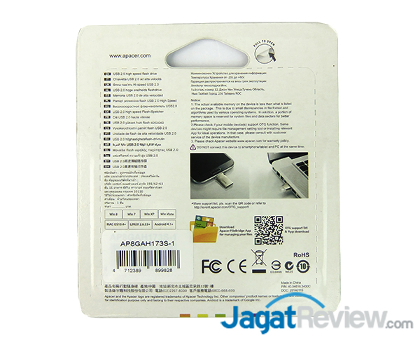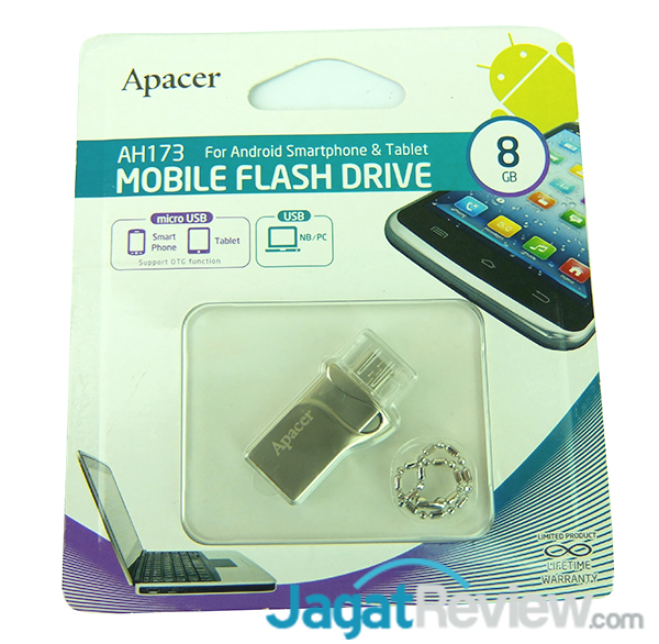Apacer merupakan salah satu produsen storage yang menyediakan varian produk USB OTG tersebut. Kali ini, salah satu produk USB OTG yang hadir di meja pengujian JagatReview adalah Apacer AH173 Mobile Flash Drive yang berkapasitas 8 GB. Flash drive Apacer ini sendiri memiliki tiga varian kapasitas, yaitu 8 GB, 16 GB dan 32 GB.